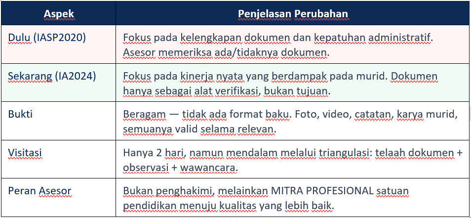 Instrumen Akreditasi 2024 (IA 2024) membawa perubahan mendasar dalam cara menilai mutu satuan pendidikan. Asesor tidak lagi sekadar memeriksa kelengkapan dokumen, melainkan menilai KINERJA NYATA sekolah yang berdampak pada murid.