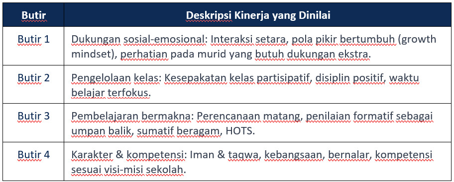 Durasi: 30-45 menit per guru. Pilih minimal 3 guru dari mata pelajaran berbeda. Tujuan: Menggali data Komponen 1 (Kinerja Pendidik).