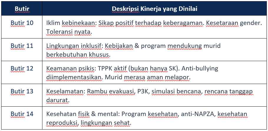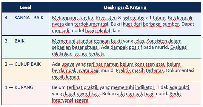 - Bila dokumen ada, suasana kondusif, dan murid merasa aman → bukti kuat → skor tinggi