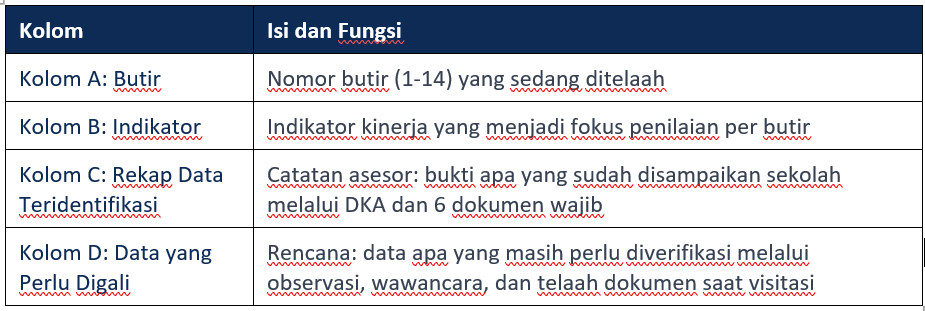 Asesor dapat memanfaatkan AI (seperti ChatGPT, Claude, Gemini, Grok dll.) untuk membantu menganalisis DKA sekolah dan menghasilkan daftar pertanyaan wawancara yang relevan. Caranya: (1) Paste isi DKA sekolah ke AI, (2) Minta AI mengidentifikasi klaim yang perlu diverifikasi, (3) Minta AI membuat pertanyaan probing untuk setiap butir. NAMUN: Keputusan akhir dan penilaian tetap sepenuhnya merupakan tanggung jawab asesor sebagai instrumen utama.